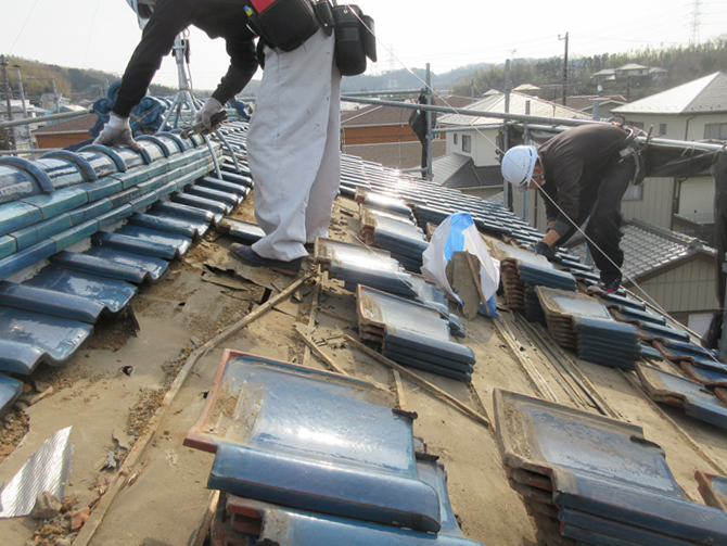 5. ふき替え工事:葺き土・下地を撤去し、新しい屋根材を施工。