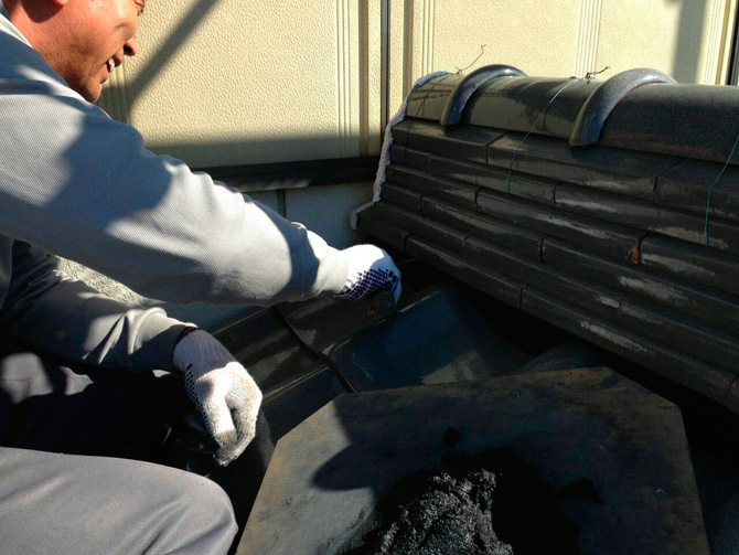 3. 新しい漆喰を塗り込む 瓦の隙間や土台部分に押し込むように塗る